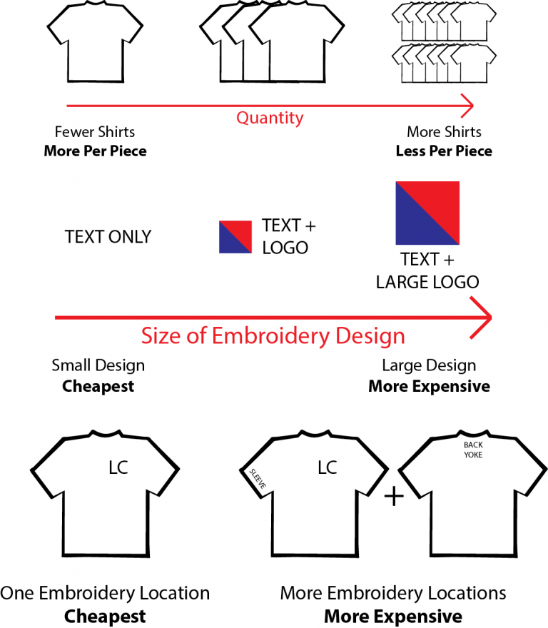 Customized products have a lot of pricing variables, so here’s a quick breakdown for embroidered items. Embroidery pricing per shirt depends on the shirt, the quantity, number of embroidery locations, and size of the logo(s).