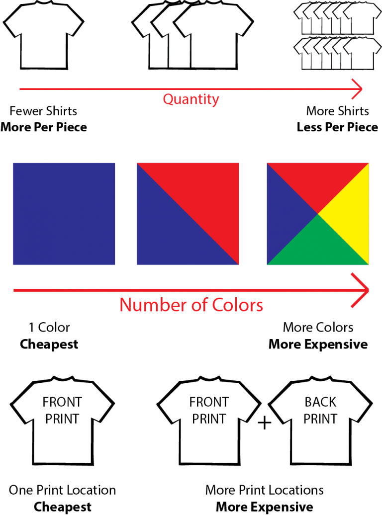 Customized products have a lot of pricing variables, so here’s a quick breakdown for screen printed items. Screen printing pricing per shirt depends on the shirt, the quantity, number of print locations, and how many colors are in the design.